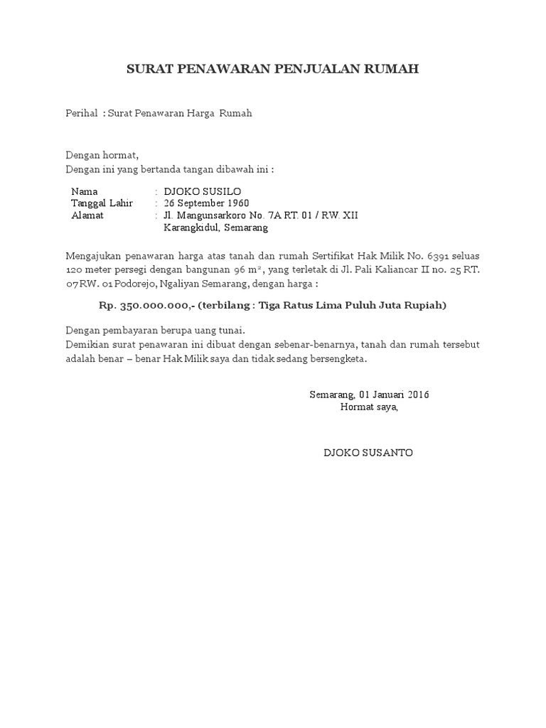 Ini bisa dimanfaatkan bagi tuan tanah untuk mendapatkan keuntungan. Keberhasilan suatu penawaran tentunya dilandasi oleh surat penawaran tersebut. Berkembangnya bisnis perumahan, menyebabkan harga tanah semakin naik. Disamping memiliki pengaruh yang baik untuk membuat jenis usaha kita dapat laris dan laku dipasaran. Contoh surat penawaran harga rumah, barang elektronik dan furniture. Dalam dunia bisnis, penawaran akan selalu ada antara pihak satu dengan pihak lainnya. Jenis pertama yaitu surat penawaran harga. Surat penawaran merupakan suatu surat yang ditujukan kepada suatu instansi yang bertujuan untuk menawarkan sesuatu. Dalam lingkup bisnis surat penawara kerjasama amatlah penting dan sangat sering digunakan. Didalam surat penawaran ini, bapak wiranto juga sudah menuliskan nomor sertifikat rumah, ukuran tanah, ukuran bangunan, alamat rumah dan. Sehubungan dengan surat tersebut, kami bermaksud menawarkan salah satu tanah properti kami, yakni sebagai berikut posted in umumtagged contoh penawaran harga proyek, contoh surat pemesanan, contoh surat. Letak/lokasi nama pemilik luas tanah status tanah harga penawaran : Melalui surat ini, saya bermaksud untuk mengajukan penawaran harga tanah yang saya miliki.